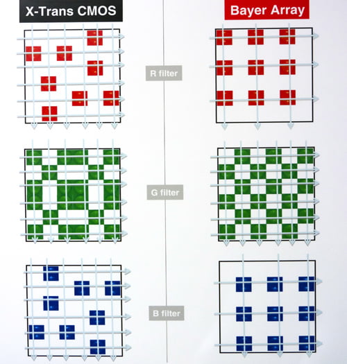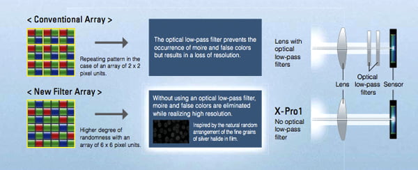 La XPro1 se basa en un sensor X-Trans CMOS, que a diferencia de la mayoría de la competencia se basa en un nuevo patrón de disposición de pixeles al del tradicional Bayer. El motivo es reducir el muaré debido a la eliminación del filtro del paso bajo, que por la misma razón que la nueva Nikon D800E, se ha echo para conseguir mayor detalle en la imagen.