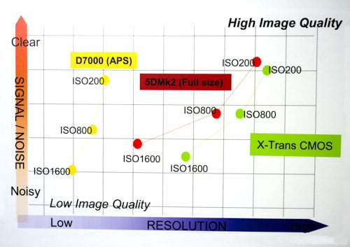 Nos han mostrado varias comparaciones entre archivos JPG y RAW de cámaras de la competencia como Canon y Nikon, con las tomas de la X-Pro1. Según el ponente de la presentación y lo que se nos mostraba, el resultado global que se extrae es que la calidad de la imagen que obtenemos es igual o superior al de soluciones de formato completo mas caras. Realmente soy escéptico ante este aspecto, ya que la comparativa era entre RAW y JPG de la competencia y JPG directos de cámara de la X-Pro1, porque según nos comentan el software de revelado Silkypix de Fuji no revela correctamente los RAW de la competencia y de momento no hay actualización para Lightroom que permita interpretar la nueva matriz del sensor Fuji. Se me hace difícil de creer que una cámara de 1600 euros como la X-Pro1 de calidades iguales o superiores a los de la Nikon D3s de mas de 4000 euros, o que superé claramente a la Canon 5D Mark II o la Nikon D7000. Eso no quita que la definición que mostraban las imágenes era muy alta y que el ruido en todas las sensibilidades era bastante contenido, lo que da muestras de que es una cámara de buena calidad, pero me parece algo exagerado este análisis sin poderlo haber comprobado personalmente. En este gráfico podéis ver las comparaciones que según la marca, se dan entre las distintas sensibilidades de los modelos Fuji, Canon y Nikon y la relación que hay entre ellas.