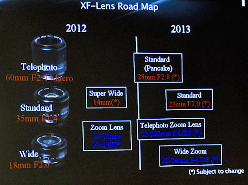 De momento hay disponibles tres objetivos: el 18mm f2 (28mm), el 35mm f1.4 (50mm) y el 60mm f2 Macro (90 mm). Hay planeados mas objetivos fijos y alguno zoom, pero de momento habrá que esperar.