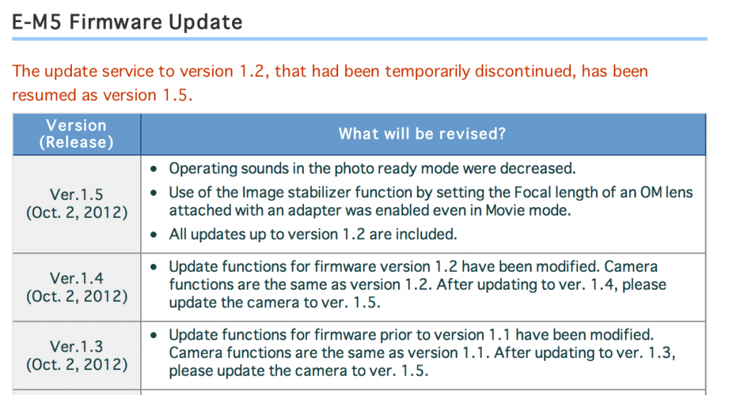 Los propietarios de una Olympus E-M5 podeis actualizar vuestra cámara a la versión 1.5. Olympus ha agrupado todas las pequeñas actualizaciones en un gran lanzamiento único. La captura de pantalla en la parte superior muestra la lista de las cosas arregladas.