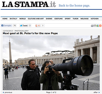 La web del italiano La Stampa publicó dos imágenes del fotógrafo Dylan Martinez a la espera de fotografiar al nuevo Papa en la Plaza de San Pedro con el monstruoso Nikkor 1200-1700mm f/5.6-8P IF-ED. El objetivo cuenta con 18 elementos en 13 grupos, 9 hojas del diafragma, el ángulo de visión es de 2 ° -1 ° 30 ‘, la distancia mínima de enfoque es de 10 m (32 pies), pesa 16 kg y mide 888mm de largo. Otros detalles del objetivo se pueden encontrar aquí .